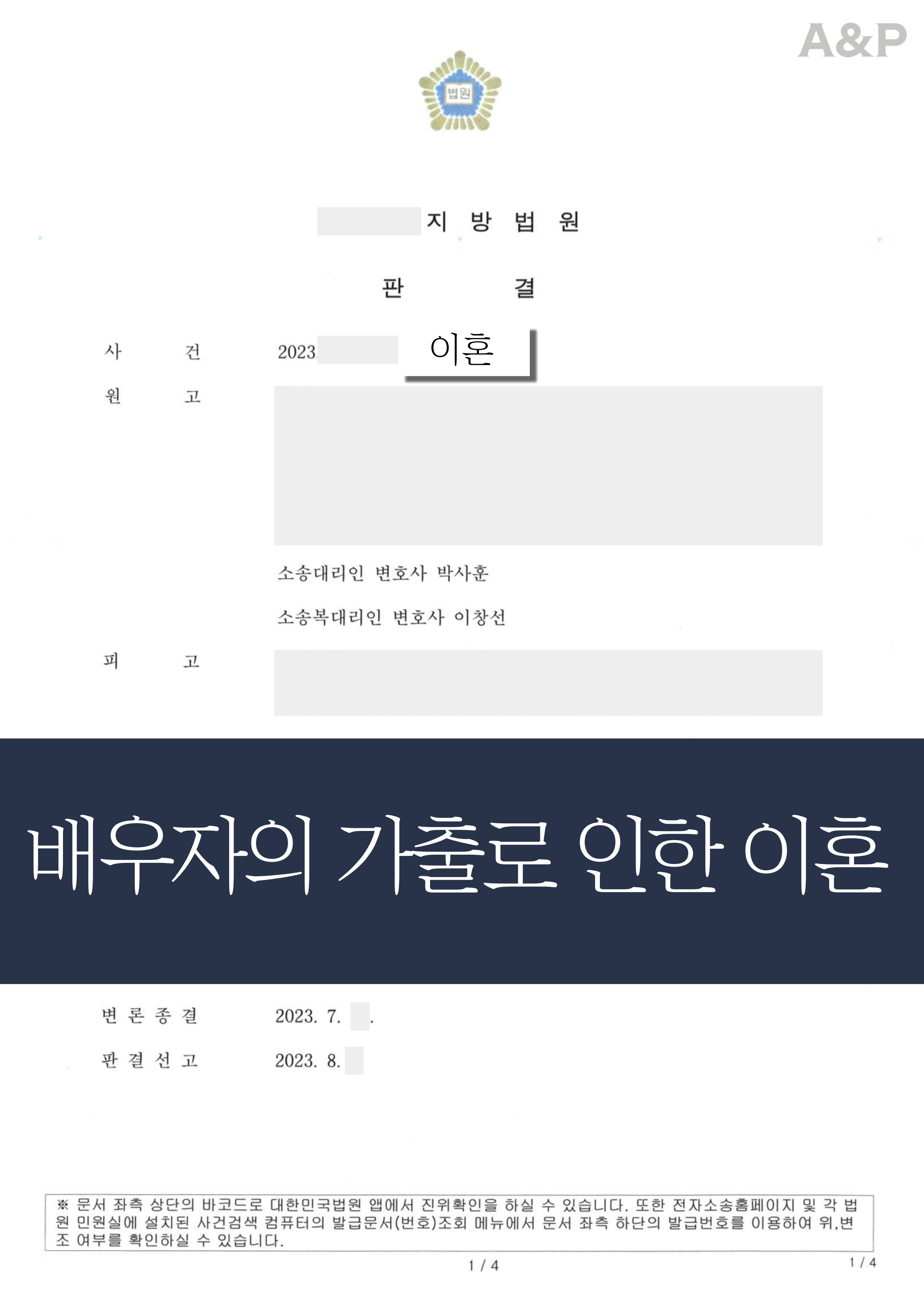 ✔ 이 사건은 배우자의 장기 가출과 연락 두절이라는 특수한 상황에서도, 법에서 정한 재판상 이혼 사유를 정확히 주장하면 혼인관계를 정리할 수 있음을 보여준 사례입니다.