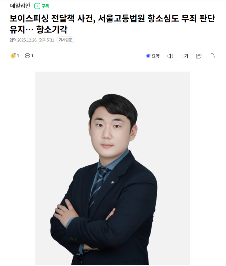 이 보도는 보이스피싱 사건에서 이른바 ‘전달책’으로 기소된 피고인에 대해, 1심 무죄 판결에 이어 항소심에서도 무죄 판단이 유지된 사례를 다룬 기사입니다.
