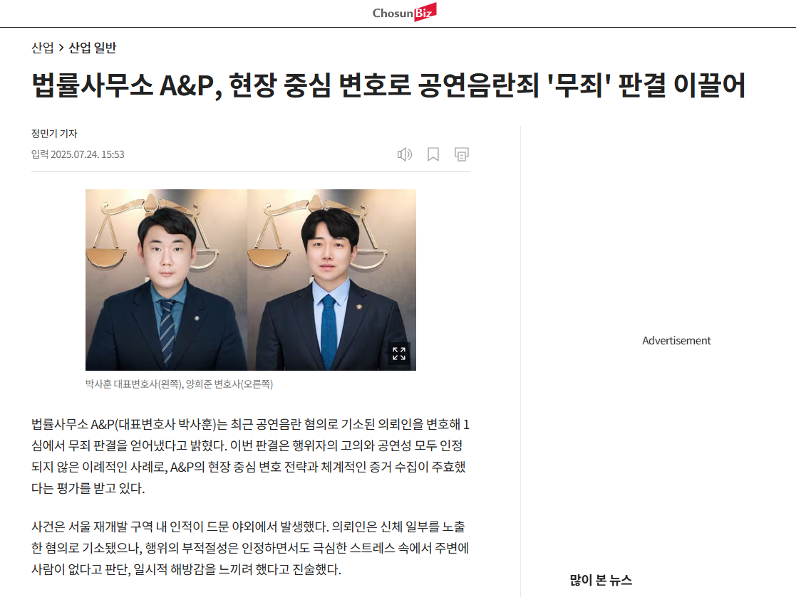 이와 같은 형사 사건에서는 초기 단계부터 현장 상황과 객관적 자료를 면밀히 검토하는 것이 중요하며, 법률사무소 A&P는 공연음란죄를 비롯한 형사 사건 전반에서 사실관계 분석과 증거 정리를 바탕으로 한 변호 업무를 수행하고 있습니다.