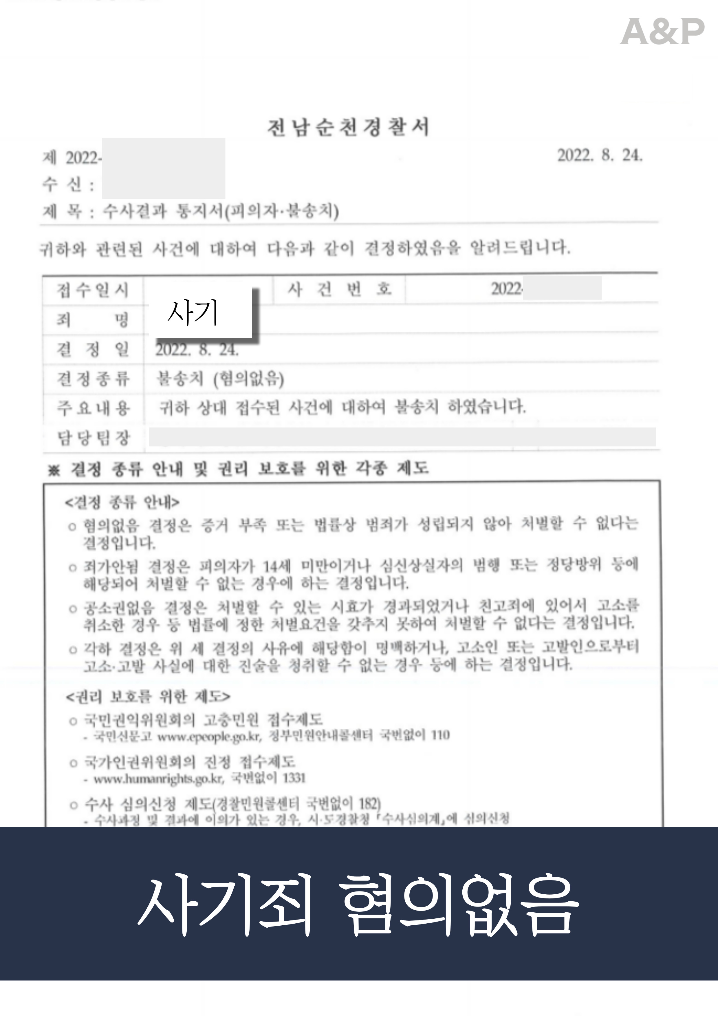 이에 지인은 의뢰인이 처음부터 돈을 갚을 의사가 없었다며 사기죄로 형사 고소를 하였고, 의뢰인은 억울하게 형사 피의자 신분이 되어 법률사무소 A&P를 찾아 도움을 요청하셨습니다.