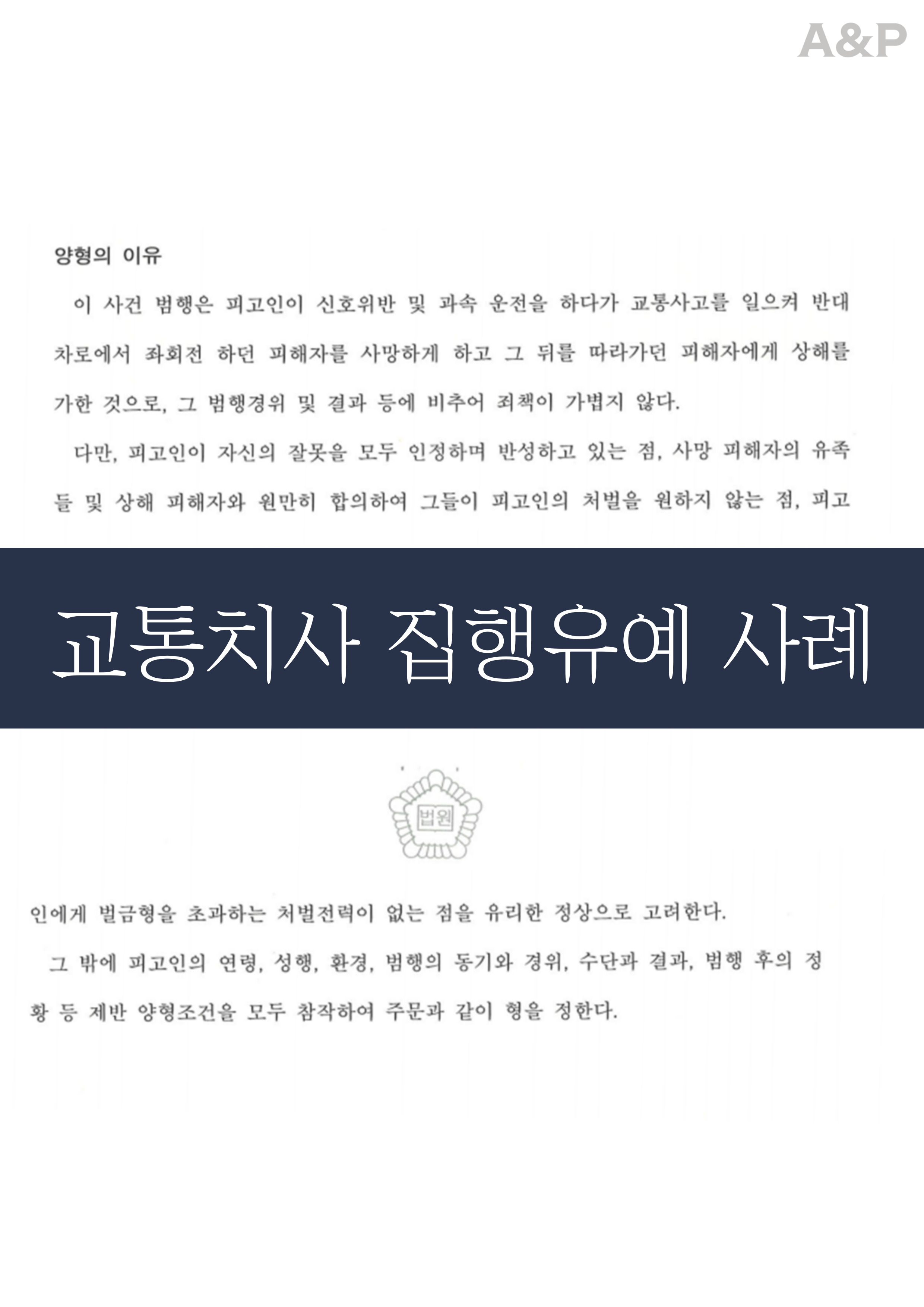 법원은 제출된 자료와 합의 내용을 종합해 교통사고처리특례법위반(치사) 및 (치상)에 대해 금고형 집행유예를 선고했습니다.