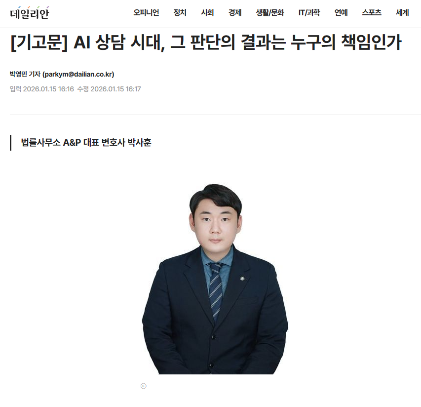 이 기고문은 생성형 인공지능(AI)이 법률 상담의 출발점으로 자리 잡은 현실에서, 그 판단의 결과에 대한 책임이 누구에게 귀속되어야 하는지를 묻습니다.