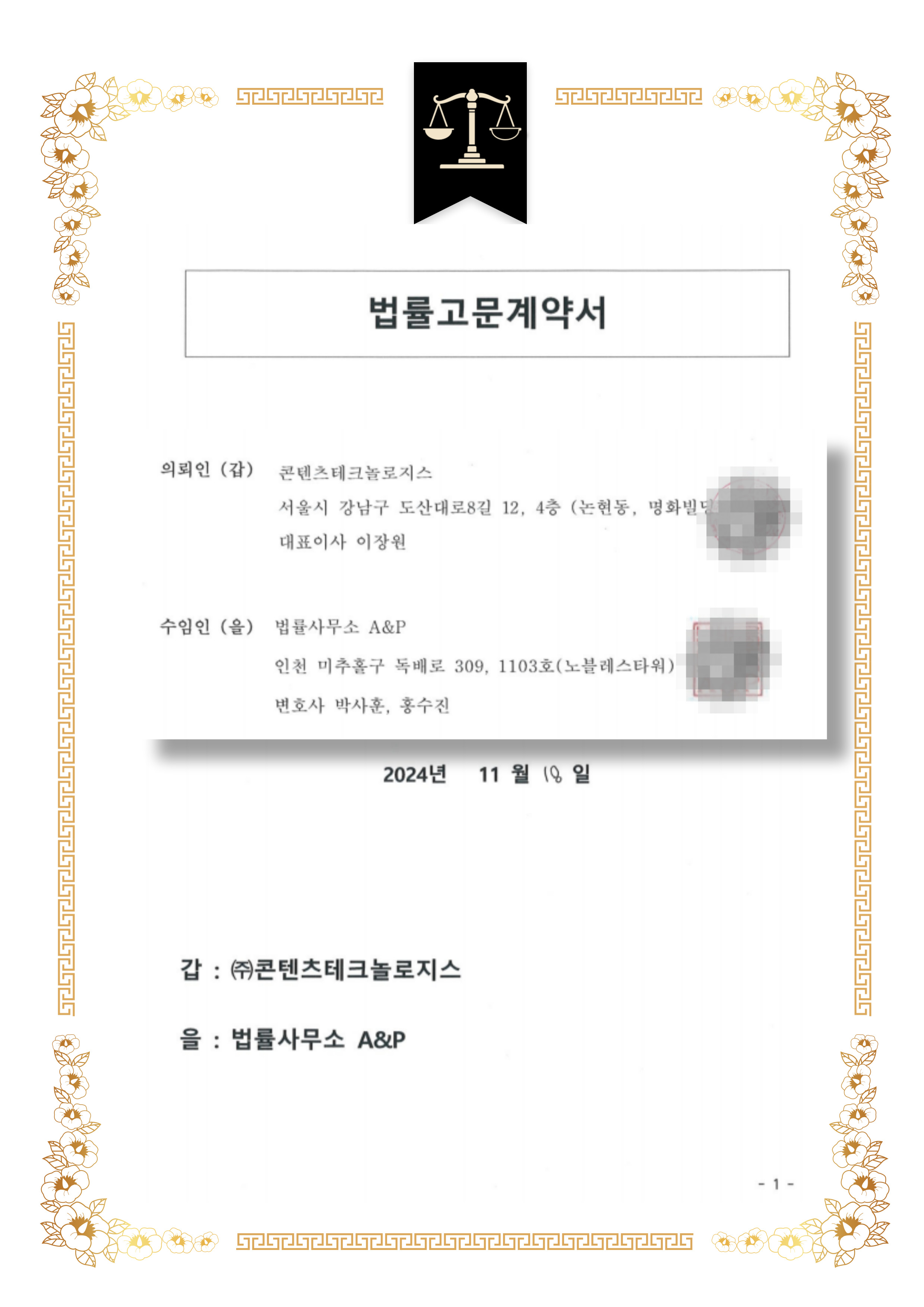 2024년 11월 18일, 법률사무소 A&P(대표변호사 박사훈)는 (주)콘텐츠테크놀로지스와 법률고문 협약을 체결하였습니다.